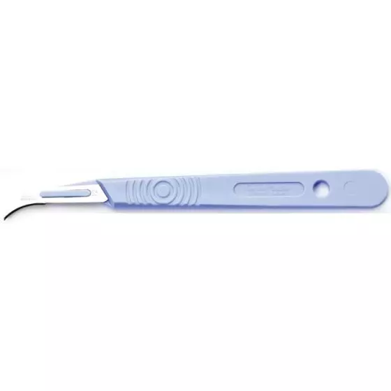 Boîte de 10 bistouris stériles sur plateau de présentation entièrement transparent, un ergot de fixation maintient le bistouri sur le plateau afin d'éviter tout risque de perforation de l'emballage transparent. De plus un évasement dans le plateau permet la prise en main du bistouri en toute simplicité de manipulation et sécurité. Les lames fixes sont en acier inoxydable montées sur un manche en plastique de couleur bleue gradué d'un coté.