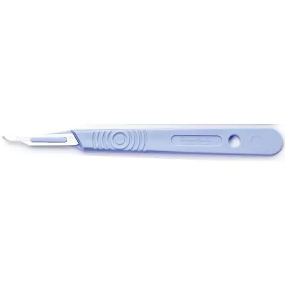 Boîte de 10 bistouris stériles sur plateau de présentation entièrement transparent, un ergot de fixation maintient le bistouri sur le plateau afin d'éviter tout risque de perforation de l'emballage transparent. De plus un évasement dans le plateau permet la prise en main du bistouri en toute simplicité de manipulation et sécurité. Les lames fixes sont en acier inoxydable montées sur un manche en plastique de couleur bleue gradué d'un coté.