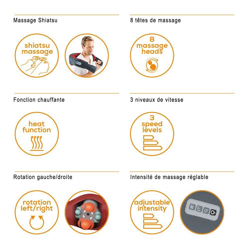 C’est grâce à la pression, principe de base des massages Shiatsu, effectuée sur les zones ciblées du corps que le travail d’apaisement s’effectue, cela permettant à la ceinture massante de stimuler et d’améliorer la sensation de bien être. De plus 8 têtes de massages rotatives 3D sont dispersés le long de l'appareil de massage pour fournir une sensation de massage la plus réaliste possible et relaxante possible. A cela s’ajoute la possibilité de régler le niveau d’intensité de la ceinture Beurer Shiatsu 3D MG 51, 3 différents réglages sont disponibles ainsi qu’une fonction chauffante pour convenir le mieux à votre besoin.