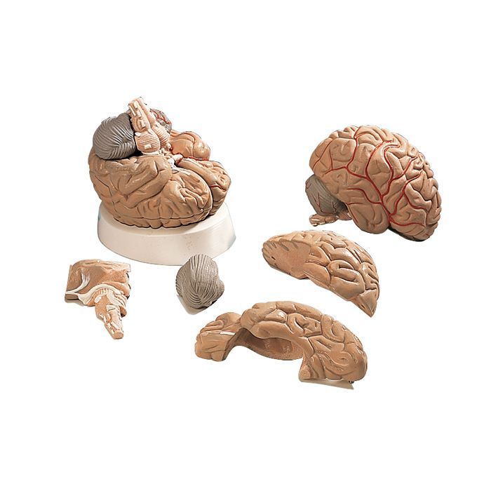 Cerveau avec artères en 5 parties VH405 - Coupe médiane - Moitié droite montre les artères cérébrales - Moitié gauche démontable - Livré sur socle amovible - Dimensions : 15.5 x 13 x 15 cm - Poids : 1 kg
