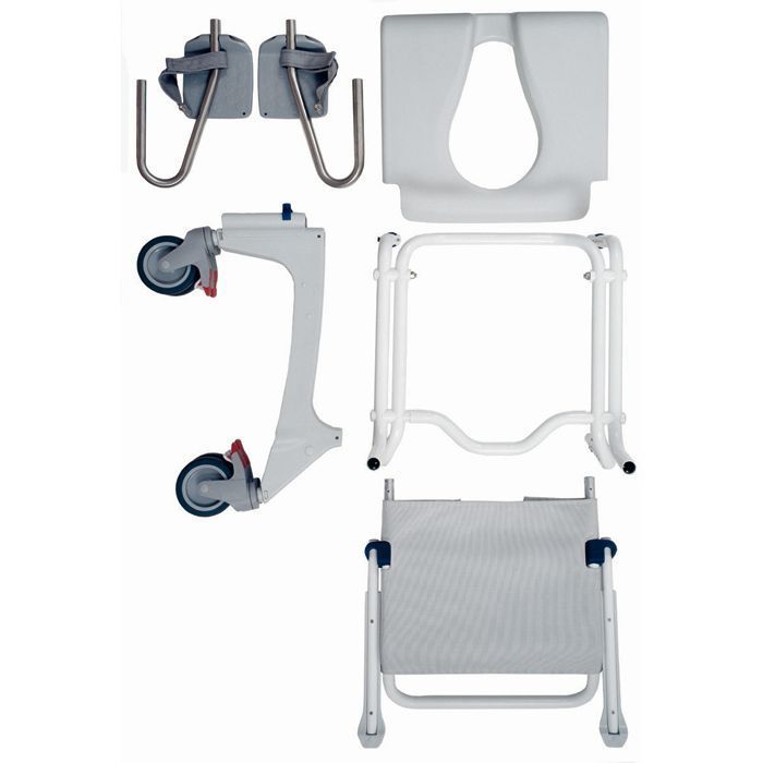 Chaise de douche Invacare Aquatec Ocean en roues 5" - En acier inoxydable - Assise réglable en hauteur - Accoudoirs escamotables - Montage sans outils - Large gamme d’accessoires - Repose-pieds - Poids : 14,5 kg - Garantie : 2 ans