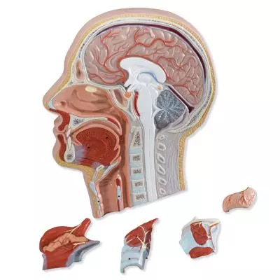 Coupe médiane de la tête en 5 parties VB156 - élements amovibles : langue avec glande sublinguale et musculature du plancher de la bouche, cartilage thyroïde avec musculature avoisinante, larynx, glande thyroïde - Dimensions : 2,5 x 23,5 x 27 cm - Poids : 1,2 kg