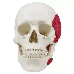 Les muscles masticatoire (muscle de masseter, muscle temporel, medialis de pterygoideus et muscles de lateralis) sont représentés sous forme de bandes élastiques. Utilisant ce modèle, il est possible de démontrer la fonction des muscles masticatoire avec la fermeture de la mâchoire inférieure, l'induction de l'ouverture de la mâchoire inférieure et le déplacement latéral et vers l'avant de la mâchoire inférieure. Le toit du crâne est démontable.
