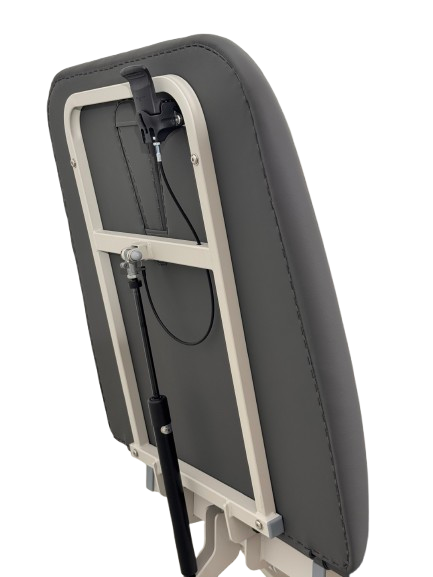 Le dossier s’incline manuellement à l’aide d’un vérin à gaz, avec un angle réglable de +90° à -23°, afin d’ajuster facilement la position selon le type de soin réalisé. Un trou facial ergonomique est également intégré pour améliorer le confort lors des positions ventrales.