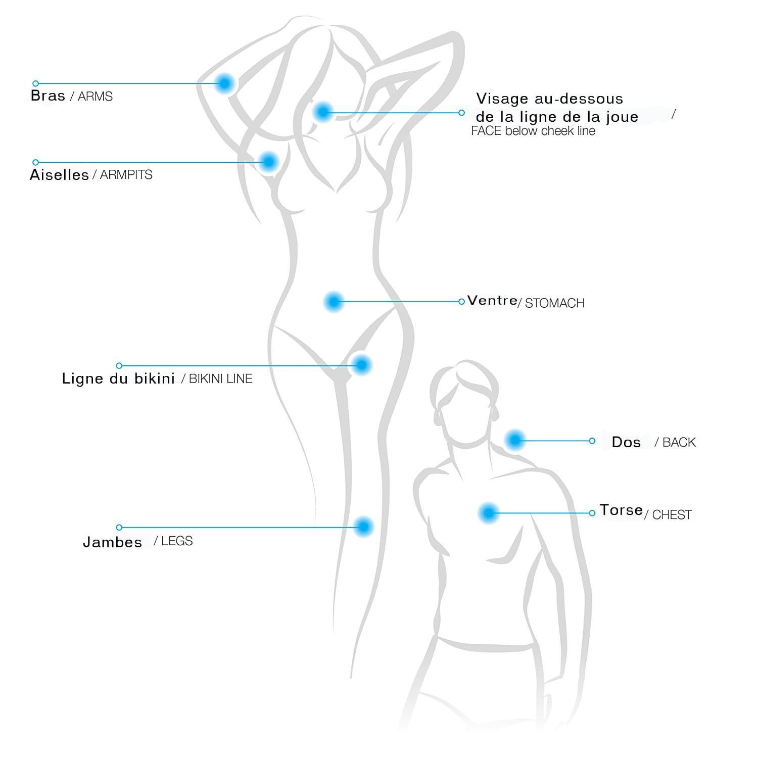 Avertissement : Ne pas utiliser sur les peaux foncées. Peut être inefficace sur les poils roux, blonds, blancs, gris.
