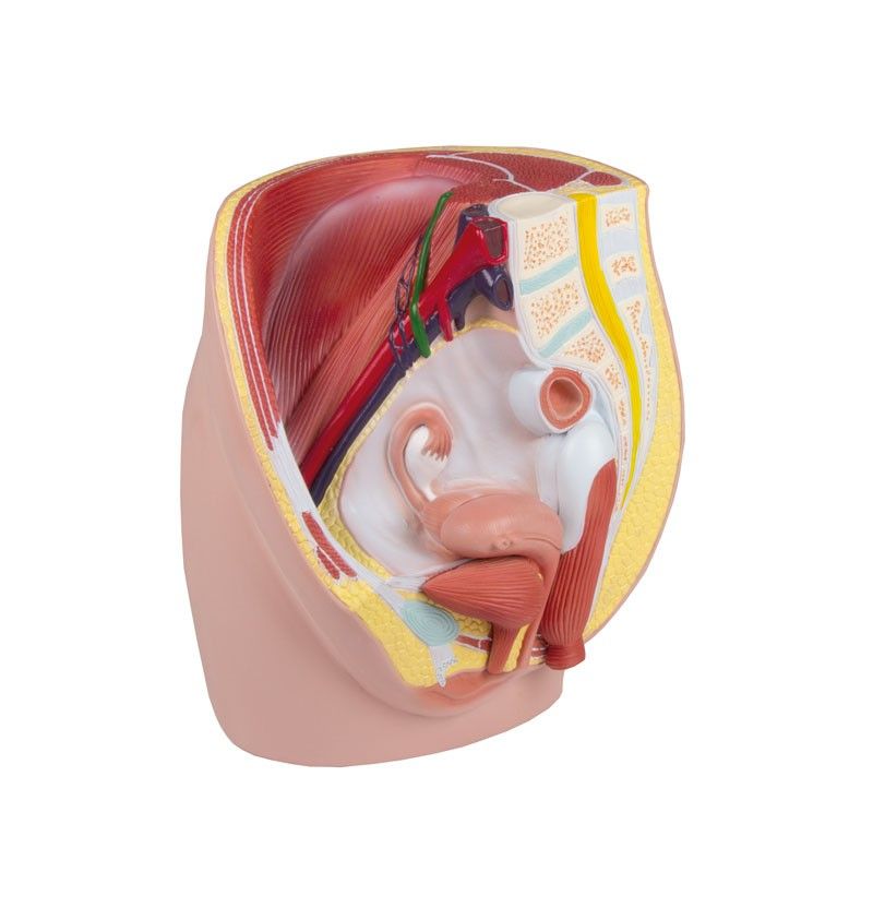 Ce modèle grandeur nature est en coupe sagittale médiane et montre le bassin féminin en 3 parties. Outre les muscles et les vaisseaux de l'abdomen, il représente en particulier les organes urogénitaux.