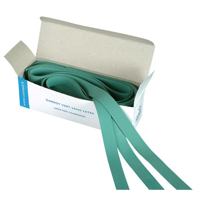 Garrot sans latex Boîte de 25 - Dimensions : 75 cm x 18 mm - Épaisseur : 1.5 mm - Conditionnement : Boîte de 25 pièces