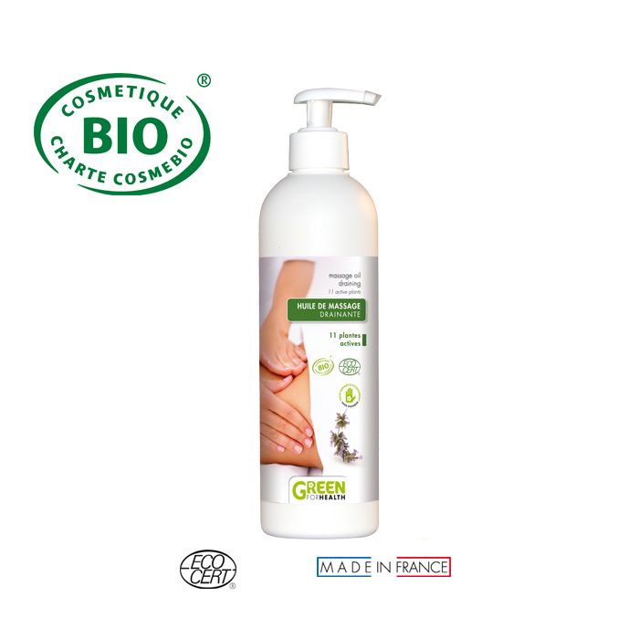 L'huile de massage drainante Bio 500 ml Green For Health 100% naturelle est conçue à partir d’extraits de 11 plantes savamment dosées pour un soin drainant optimal et un effet rapide et durable.