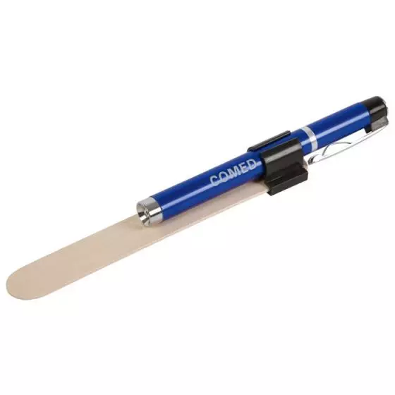 Lampe de diagnostic avec porte abaisse langue - Éclairage puissant et bien circonscrit - Allumage par bouton pressoir - Livré avec 2 piles LR03 et un porte abaisse-langue - Coloris bleu, noir, argent ou vert