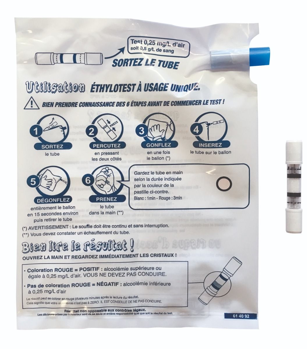 Test d'alcoolémie constitué d'un tube réactif et d'un sachet plastique contenant l'exact volume d'air nécessaire. Test homologué par le ministère de la Santé.