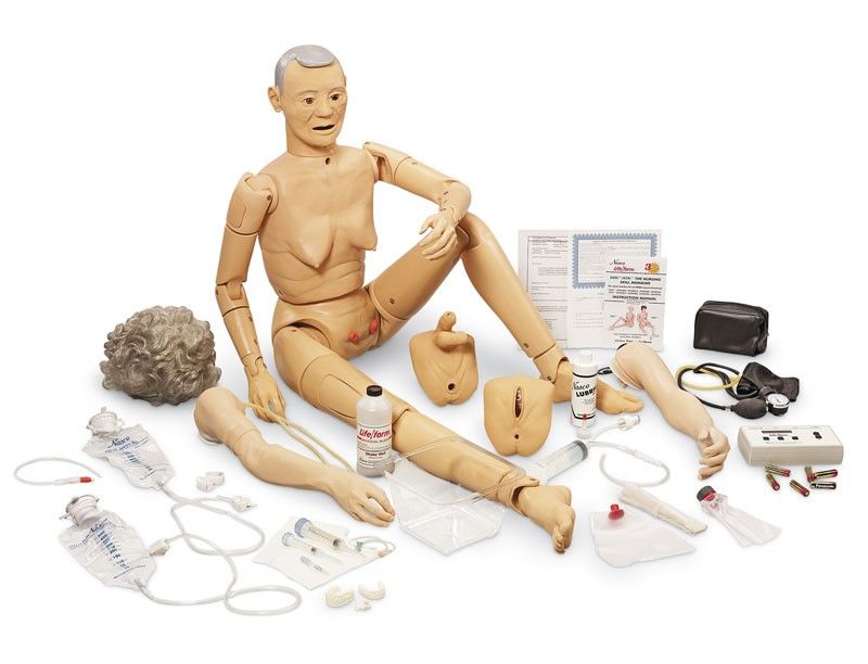 Ce modèle réaliste permet l'exercice et la simulation de soins gériatriques sur les patients âgés. Ce mannequin présente une apparence véritablement similaire à celle d'un patient humain (notamment les pieds, les mains, ainsi que le visage). Il vous sera ainsi aisé d'acquérir les compétences nécessaires à la prise en charge de patients âgés. Vous pouvez simuler plus de 35 interventions médicales. Le modèle est bisexué, en effet, il a l'apparence d'une femme, mais peut aussi se transformer en homme en retirant la perruque et en fixant les organes génitaux de l'homme. Vous pouvez ainsi procéder aux études des deux sexes sans problème.