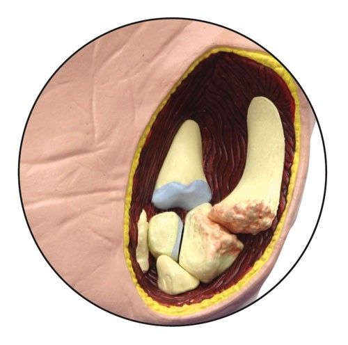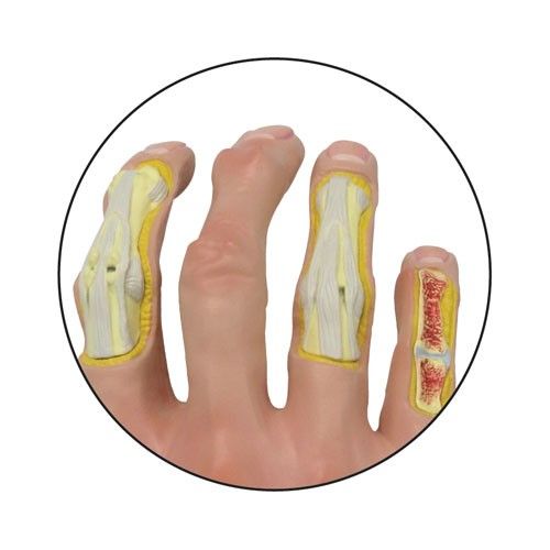 Les autres structures indirectement touchées par l'arthrose sont également visibles; ligaments, tendons, muscles et cartilages. Il est possible de comparer cette main très réaliste avec une main normale. L'article est livré avec une base de support et d'exposition, et une notice explicative en anglais.
