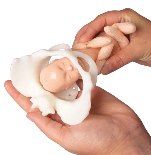 La poupée de naissance incluse combine une tête rigide avec fontanelles palpables et un corps souple en tissu, offrant une manipulation aisée et un rendu fidèle des mouvements et des positions rencontrés lors de la naissance. Cette conception favorise des démonstrations dynamiques, claires et facilement compréhensibles.