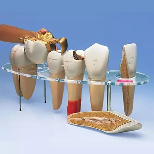 Une incisive latérale coupée longitudinalement, une canine, une prémolaire, un bridge (constitué de la prémolaire avec une couronne en or) sont amovibles. Toutes les structures importantes sont nommées directement.