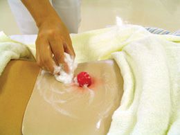 Ce modèle très adhésif pour l’entraînement à la stomathérapie est placé directement sur le corps d’un patient pour permettre à la fois au stomathérapeute et au patient de pratiquer la stomathérapie.
