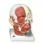 Représentation de la musculature superficielle de la tête et de la nuque avec :• glande parotide • glande submandibulaire (moitié droite) • musculature profonde (moitié gauche)• mandibule, partiellement mise à jour• avec nerfs ...