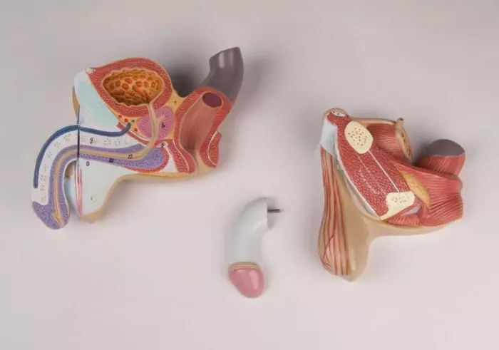 Ce modèle d'organes génitaux masculin en 4 parties L250 Erler Zimmer représente l'appareil génital de l'homme en grandeur nature, dissequé et coupé sur le plan médian. La structure interne mise à nue permet l'observation de la vessie, du rectum, de la prostate, de l'urètre, du corps caverneux et d'une partie du canal éjaculateur. Sur la surface externe sont visibles les testicules, ainsi que tous les muscles de la zone du bassin.