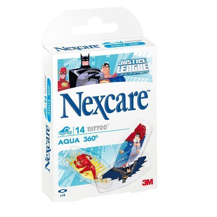 Pansements Etanches 3M Nexcare Protect Aqua 360° Justice League - Favorise la cicatrisation - Etanche à l'eau - Excellente adhérence et flexibilité - 14 pansements