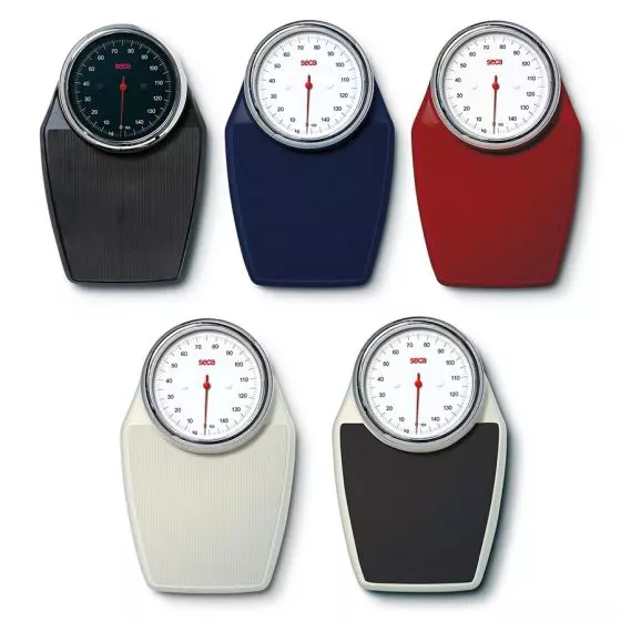 Pèse personne mécanique plat Seca 760. Tous les modèles ont en commun la bague chromée, la plateforme revêtue de caoutchouc naturel rainuré agréable au toucher, le design classique du cadran à aiguille et le mécanisme de pesage robuste mais précis.