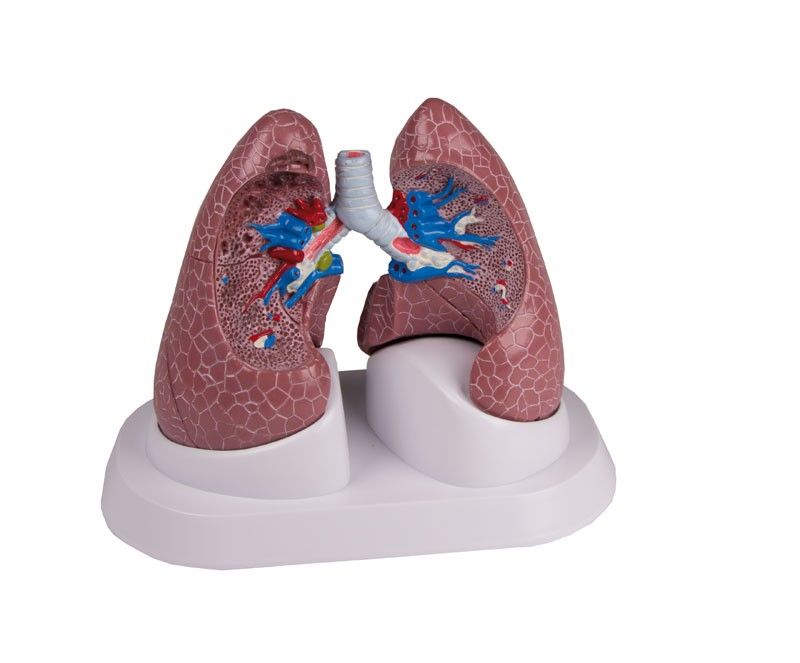 Les poumons sont des organes vitaux jouant un rôle primordial dans l'échange de gaz avec l'organisme pour l'alimenter en oxygène et en dioxyde de carbone, ils sont situés dans le thorax, et protégés par la cage thoracique. Ce set de poumons malades G52 Erler Zimmer présente un modèle double face de poumons humains, soit pas moins de 4 coupes anatomiques, une dans chaque poumon, montrant chacun un état de santé différent.