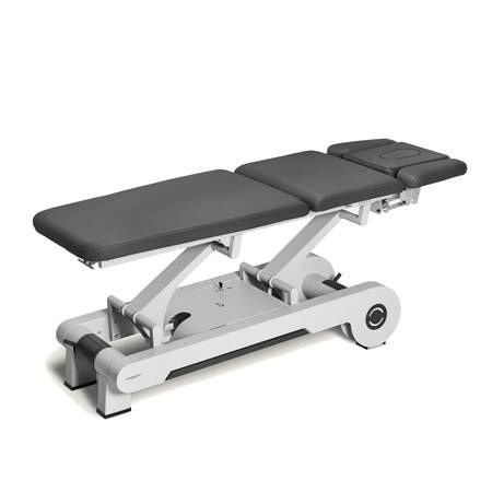 Dotée de 5 sections motorisées et de 2 moteurs électriques puissants et silencieux, la table de massage permet un réglage précis de la hauteur et des positions. Les accoudoirs ergonomiques brevetés, ajustables par vérin à gaz, offrent une liberté totale de positionnement en décubitus ventral sans gêner le praticien.