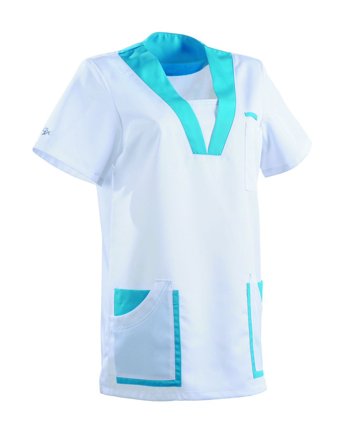 Tunique médicale femme MARIE Clemix 2.0 Blanc/Turquoise - Encolure en V - Manches montées courtes - Poche poitrine - Doubles poches basses - Fentes côtés - Longueur dos : 75 cm - Tailles disponibles : de 0 à 6