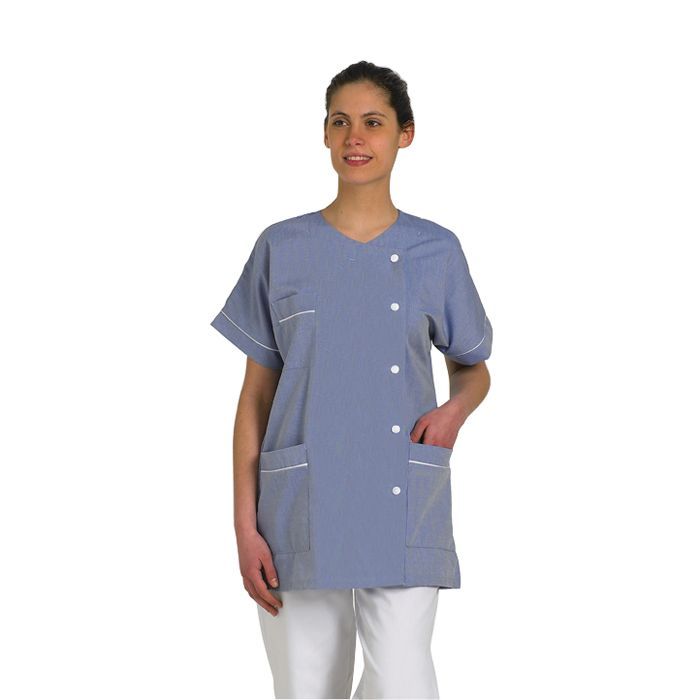 Tunique médicale femme Traxa bleu liseré blanc Mulliez - Sans col - Encolure arrondie - Boutonnage latéral - Manches courtes kimono ourlées - Boutons pressions calottés blancs - Liserés sur poches, manches - Couleur : bleu